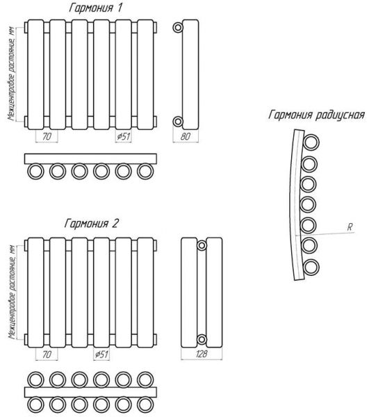 Существует 2 модификации: Гармония-1 имеет трубки с одной стороны распределяющего коллектора и модель Гармония-2 - два ряда таких трубок. Также, по желанию заказчика радиатор может быть выполнен с изгибом во внешнюю или внутреннюю сторону. Способ крепления - напольное или настенное исполнение. Подключение сбоку или снизу слева/справа.