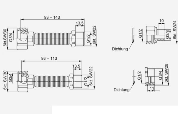 Накидная гайка G 3/4Гибкий шланг для вытягивания 50 - 70 ммPN 10, макс. 120°CНапр. для зажимных соединений HUMMEL (AKV-M, MKV, SpeedFIX)Совместимый с евроконусом.