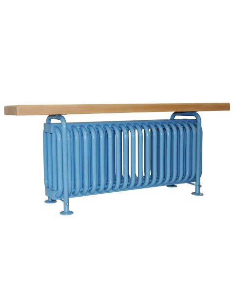 Радиатор выступает как отопительный прибор на основе стальных трубчатых радиаторов КЗТО РС с прикреплённой к нему деревянной сидушкой.