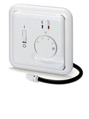 - бытовой электронный термостат с датчиком пола, с выключателем, возможно понижение ночной температуры на 3ºС или 5ºС при подключении внешнего таймера, встраиваемый.